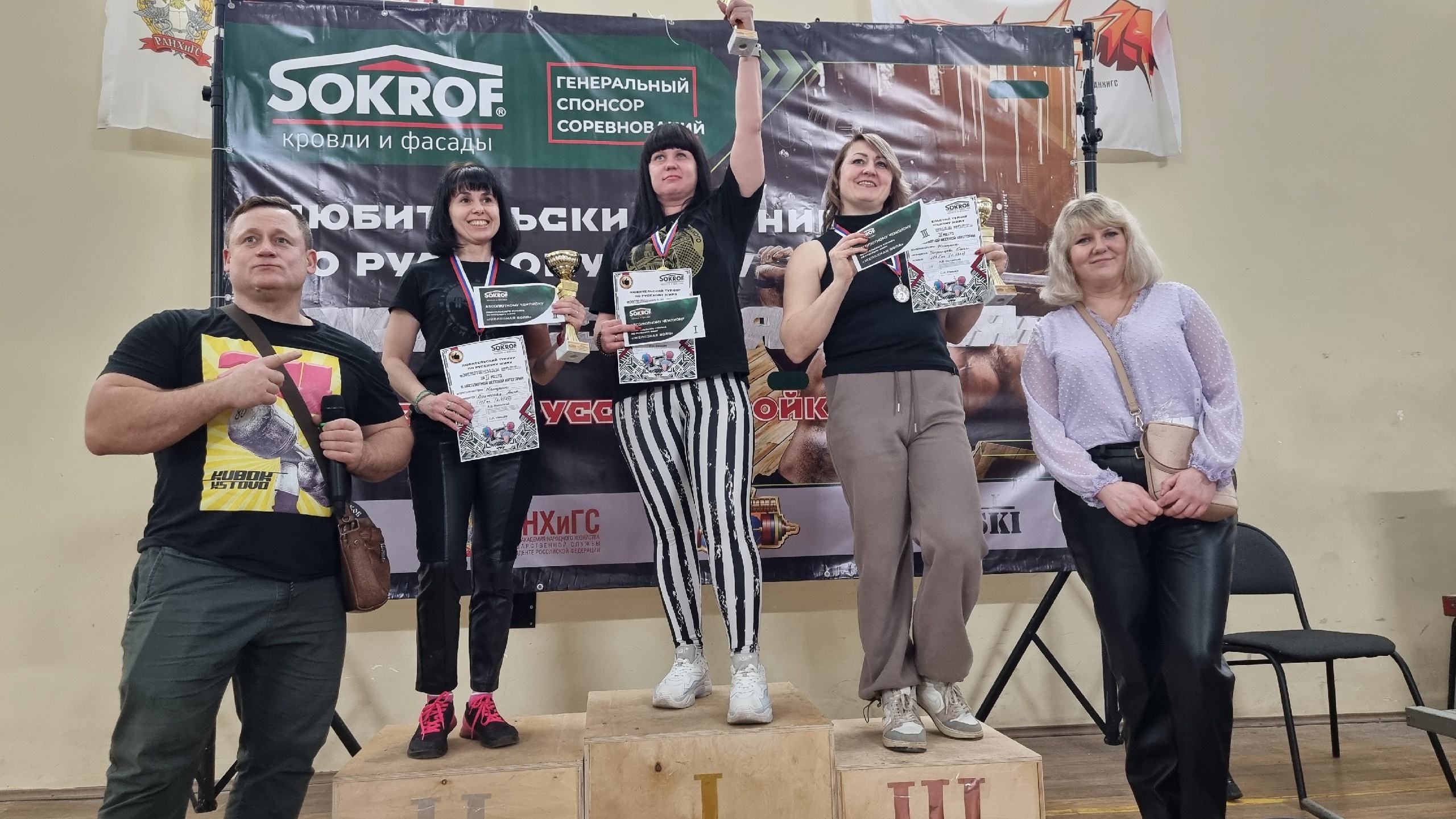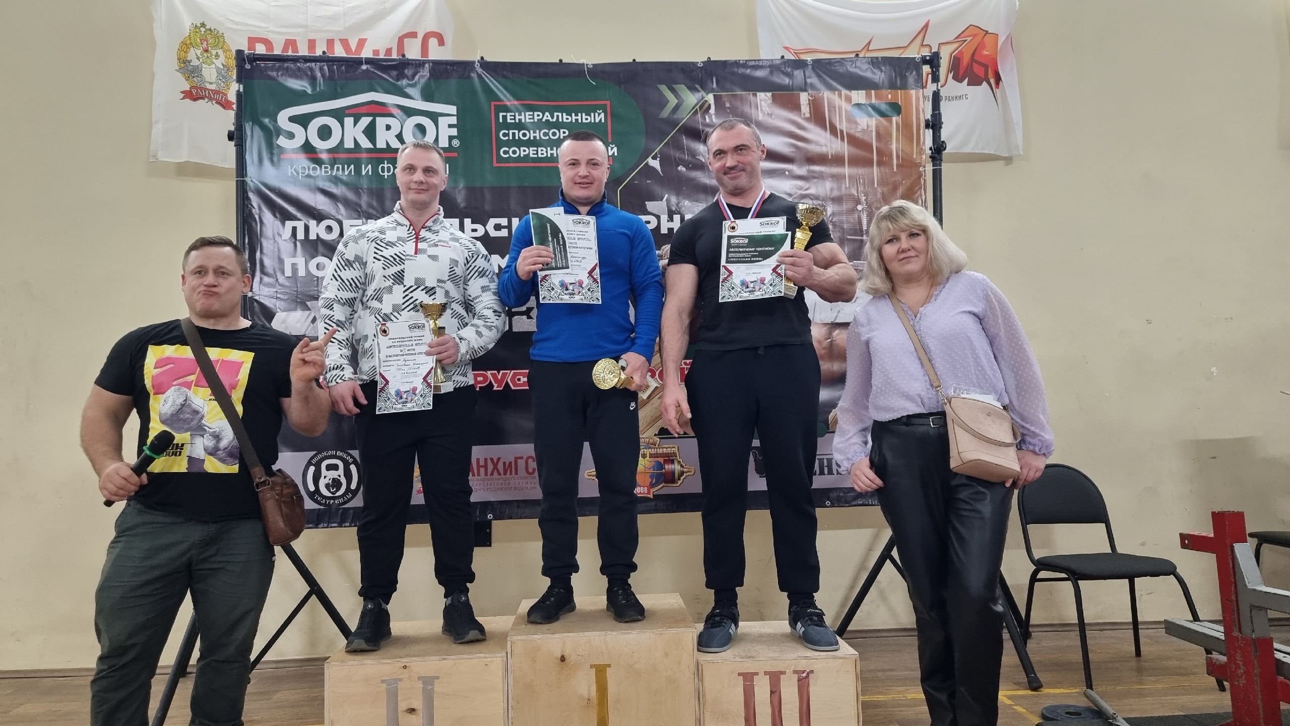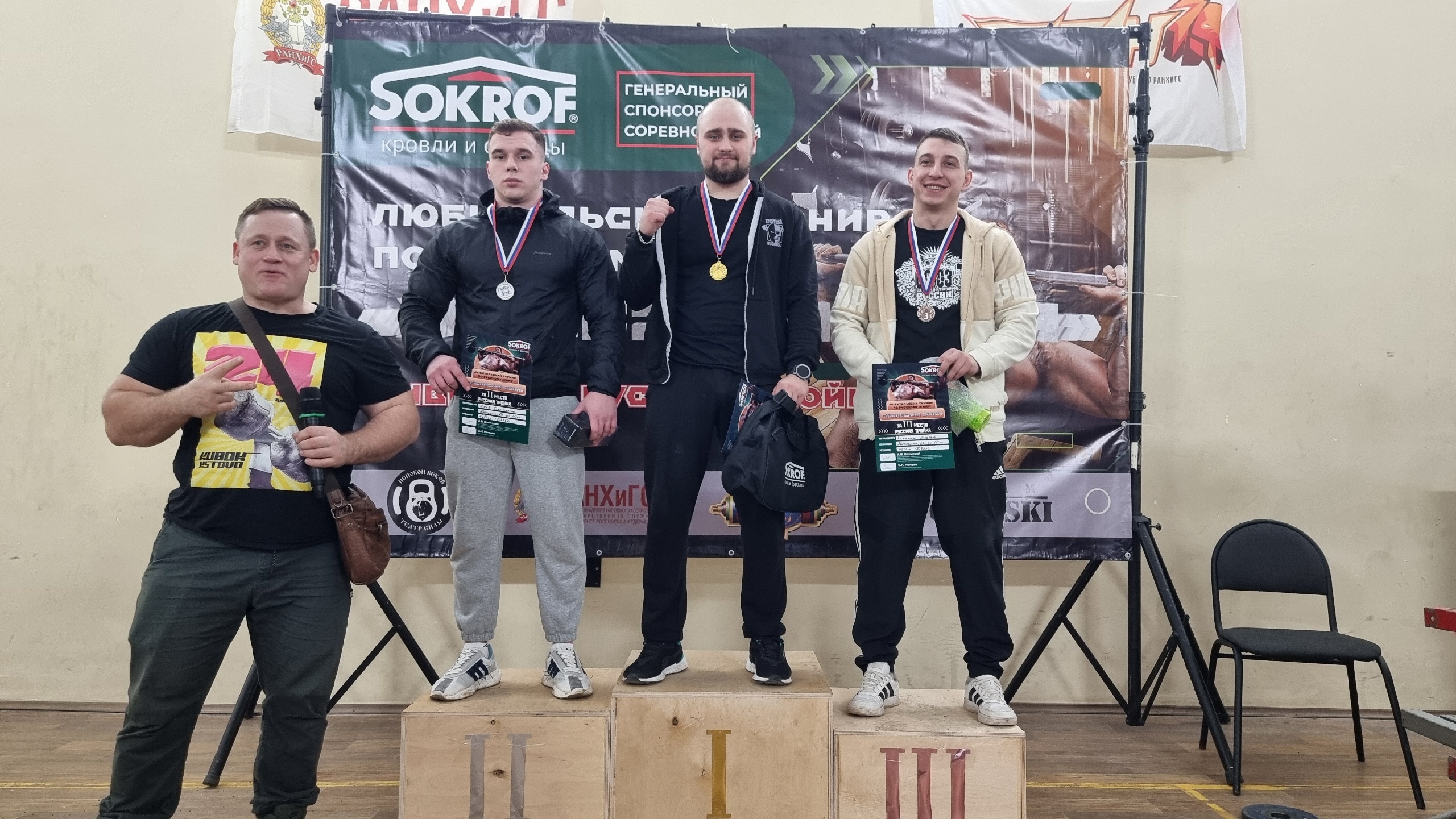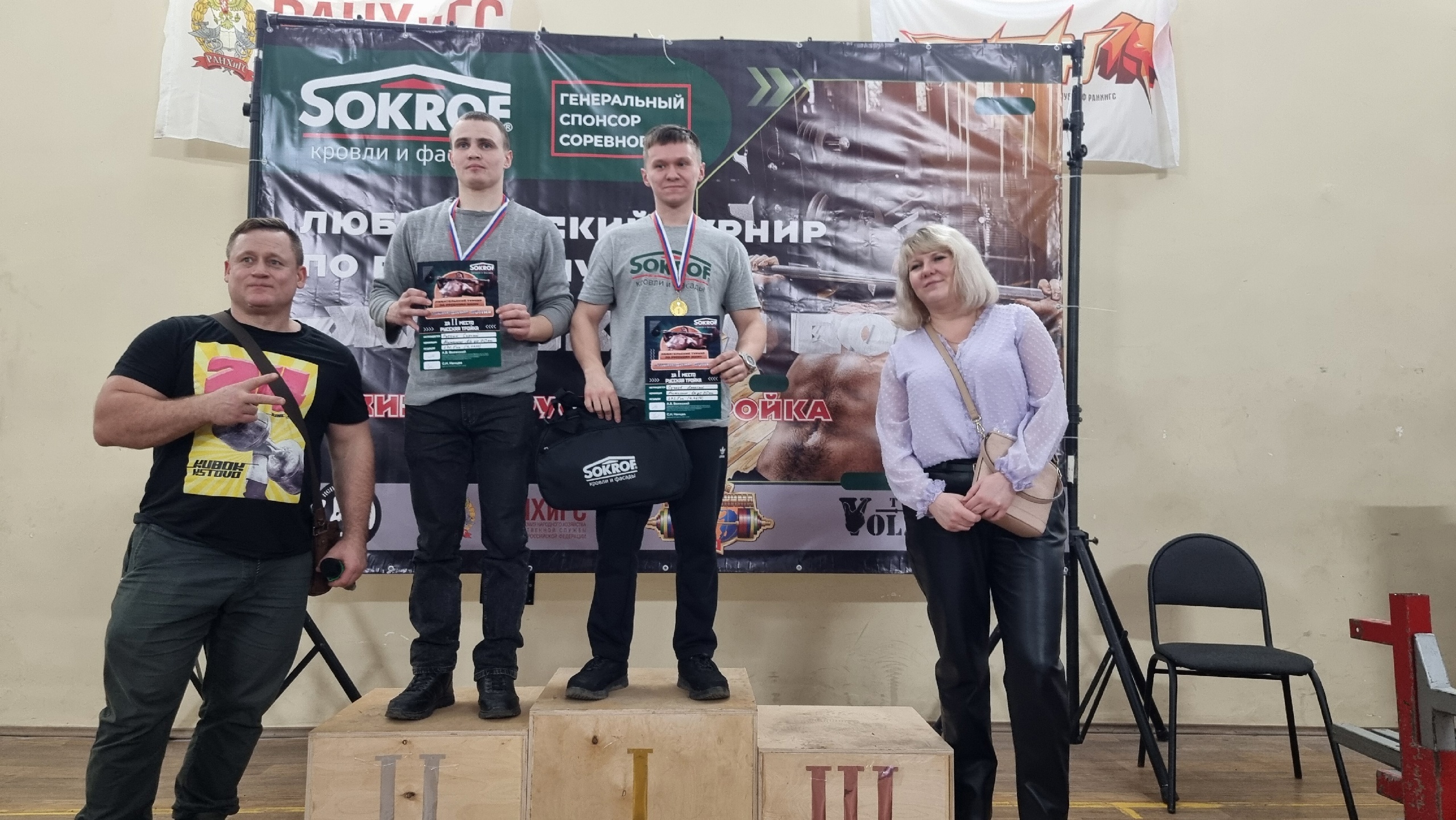 Также компания «Сокроф» благодарит за помощь в организации турнира Андрея Полякова и Театр силы, за судейство - главного судью соревнований Алексея Волжского и Дзержинский филиал РАНХиГС - за гостеприимство и предоставление зала.
